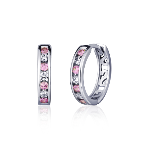 Stříbrné náušnice kroužky zdobené čirými a růžovými zirkony.