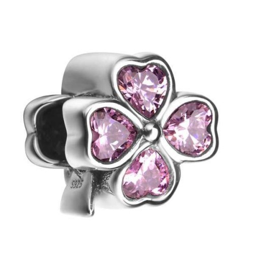 Stříbrný přívěsek - navlékací korálek ve tvaru čtyřlístku, který má lístky zdobené růžovými zirkony ve tvaru srdíčka.