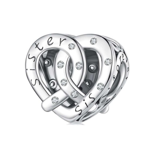 Stříbrný přívěsek - navlékací korálek ve tvaru srdíčka s nápisem "sister" a "sis" - sestra a sestřička.