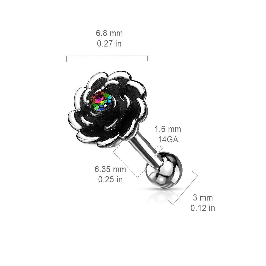 Piercing činka do ucha (tragus, cartilage piercing) z chirurgické oceli zdobený květem růže, který má uprostřed zasazený zirkon.
