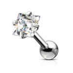 Cartilage piercing do ucha s čtvercovým čirým kamenem.