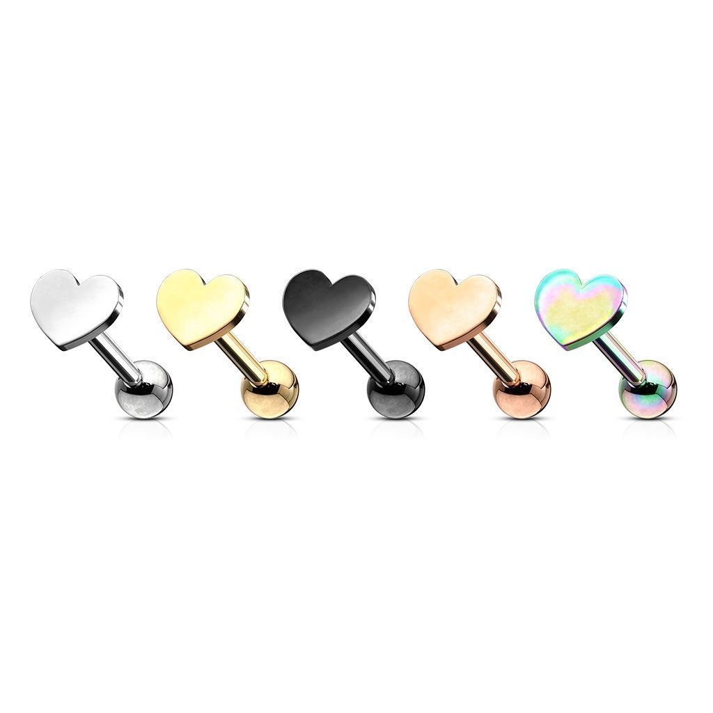 Piercing činka do ucha (tragus, cartilage piercing) z chirurgické oceli zdobený srdíčkem.