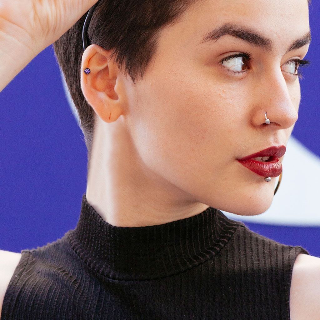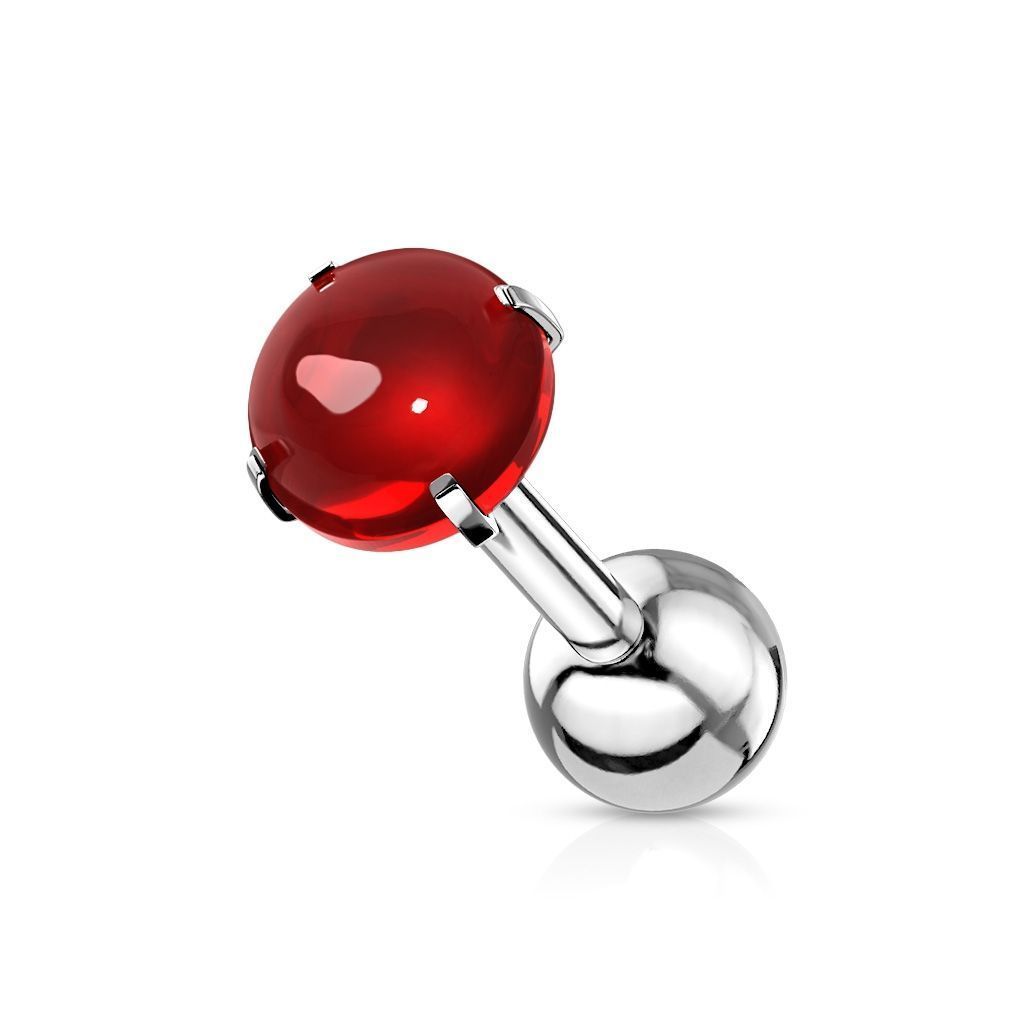 Piercing činka do ucha (tragus, cartilage piercing) z chirurgické oceli zdobený skleněným průsvitným korálkem.