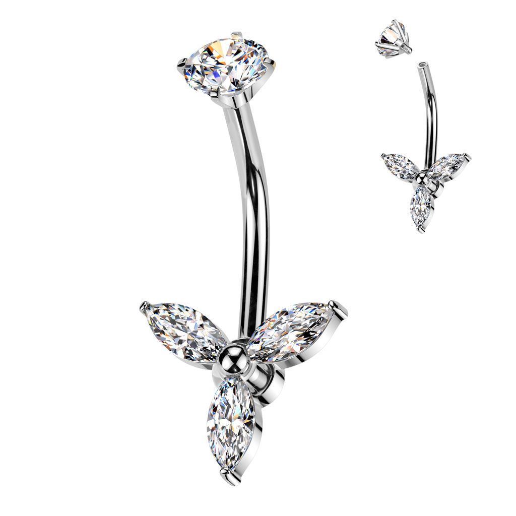 Piercingový šperk určený pro piercing pupíku. S ozdobou ve tvaru kytičky zdobené čirými zirkony.