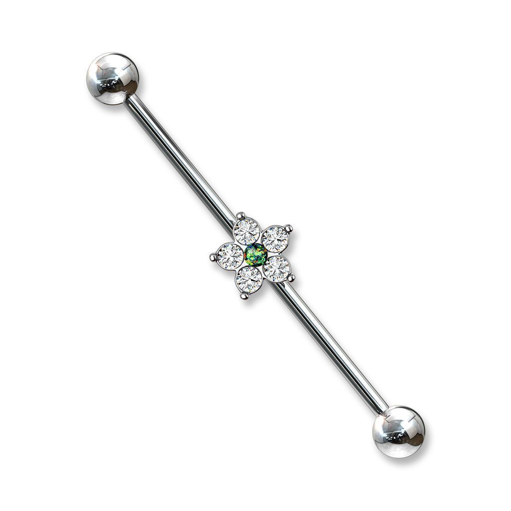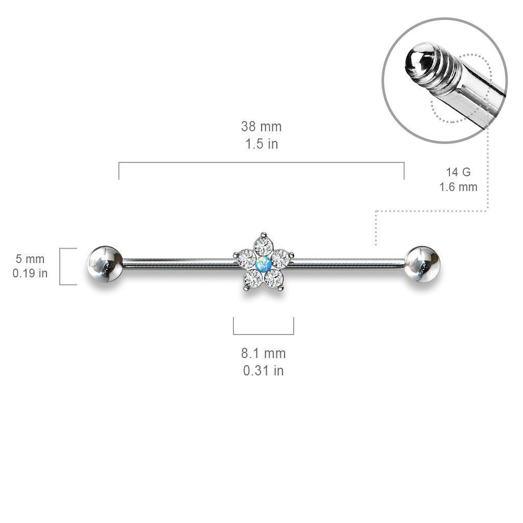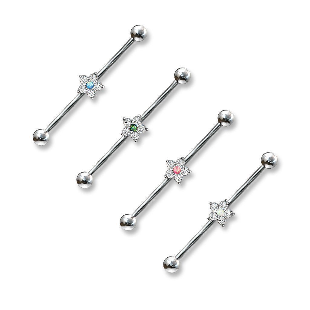 Tyčka má uprostřed ozdobu kytičky, která má uprostřed syntetický opál a ten je dokola zdoben čirými zirkony. Ozdoba jde z tyčky sundat a je tedy možné nosit industrial i bez ozdoby.