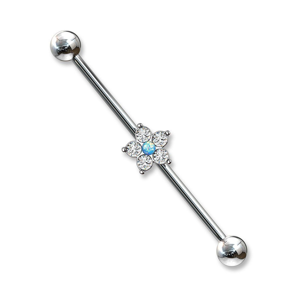 Tyčka má uprostřed ozdobu kytičky, která má uprostřed syntetický opál a ten je dokola zdoben čirými zirkony. Ozdoba jde z tyčky sundat a je tedy možné nosit industrial i bez ozdoby.
