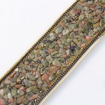 Kožený náramek béžové barvy. Náramek vyrobený z přírodní kůže, zapínání na 2 patentky ve dvou různých délkách. Náramek je zdobený přírodními léčivými kameny - unakitem.