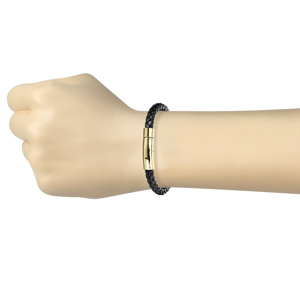 Černý kožený proplétaný náramek se zapínáním z chirurgické oceli v povrchové úpravě v barvě žlutého zlata.
