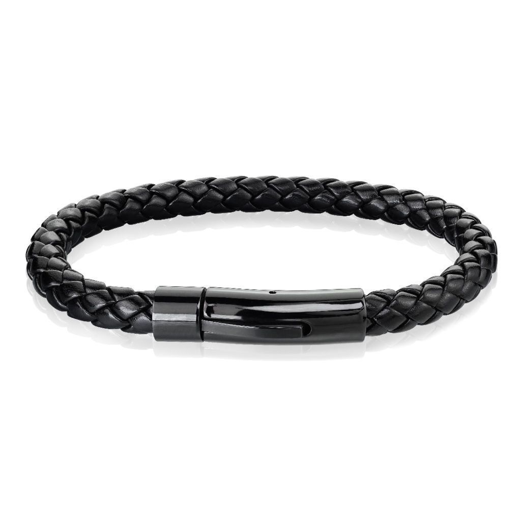 Černý kožený proplétaný náramek se zapínáním z chirurgické oceli v povrchové úpravě v černé barvě.