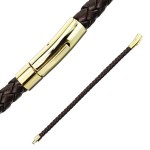 Hnědý kožený proplétaný náramek se zapínáním z chirurgické oceli v povrchové úpravě v barvě žlutého zlata.