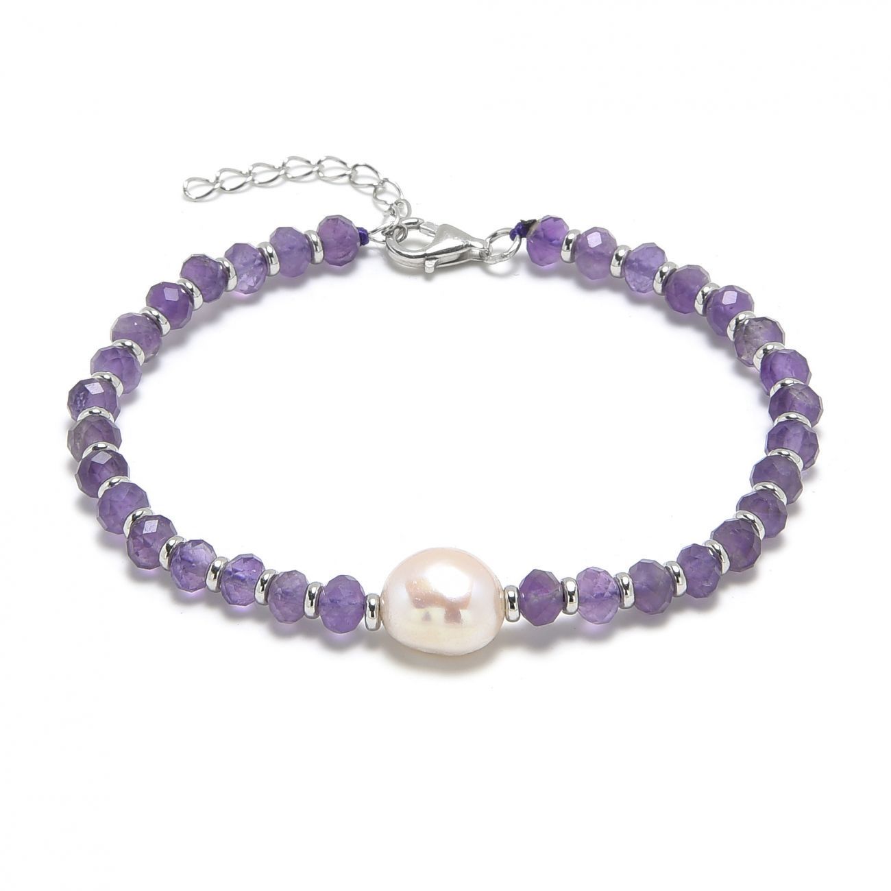 Minerální náramek přírodní Ametysty a perla, stříbro AG925