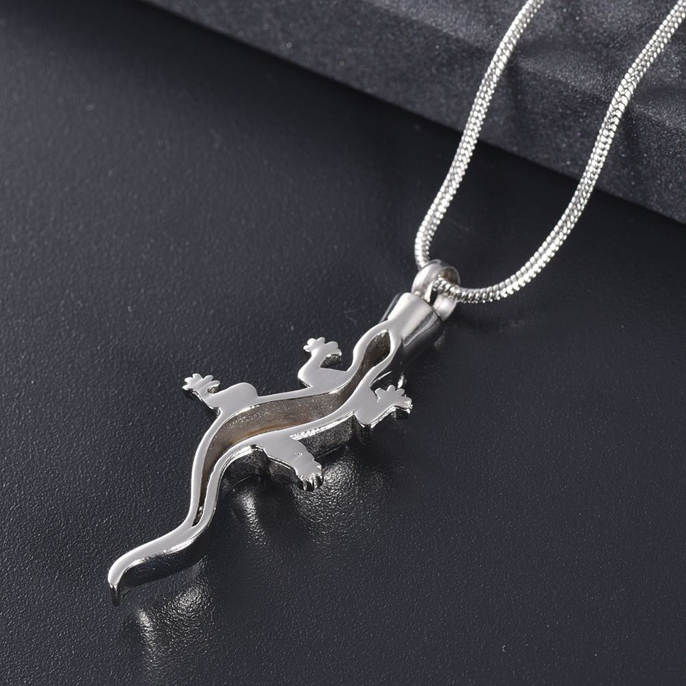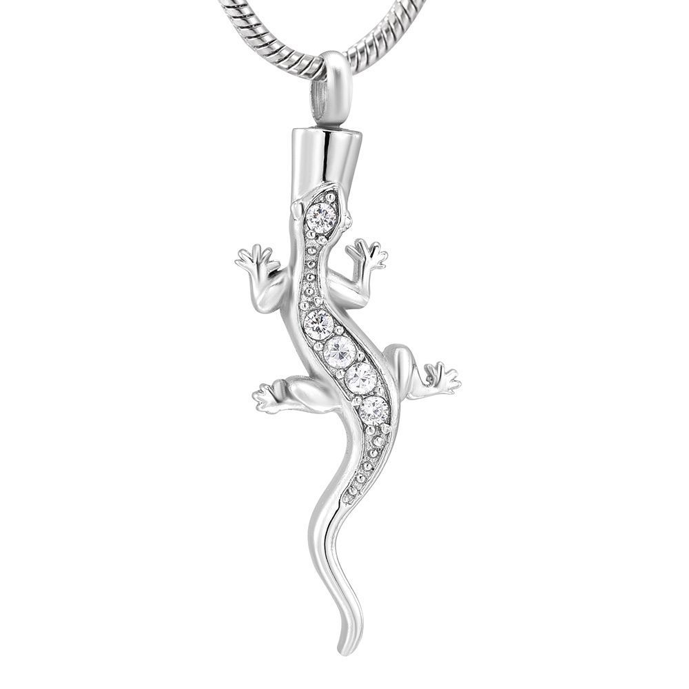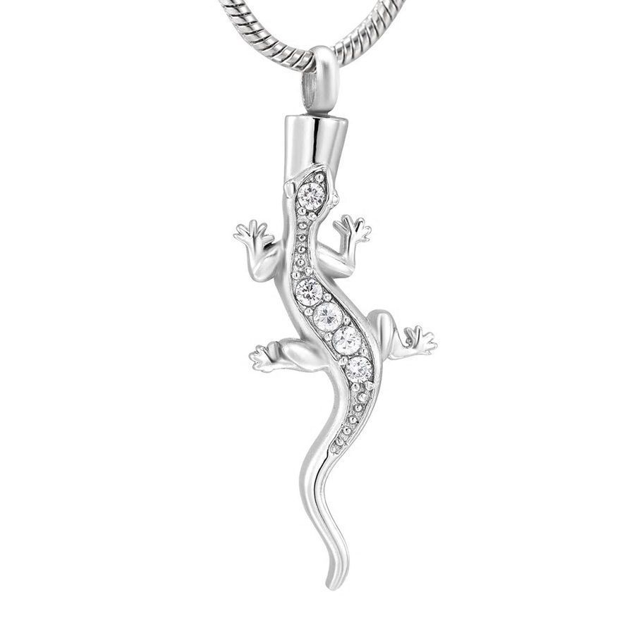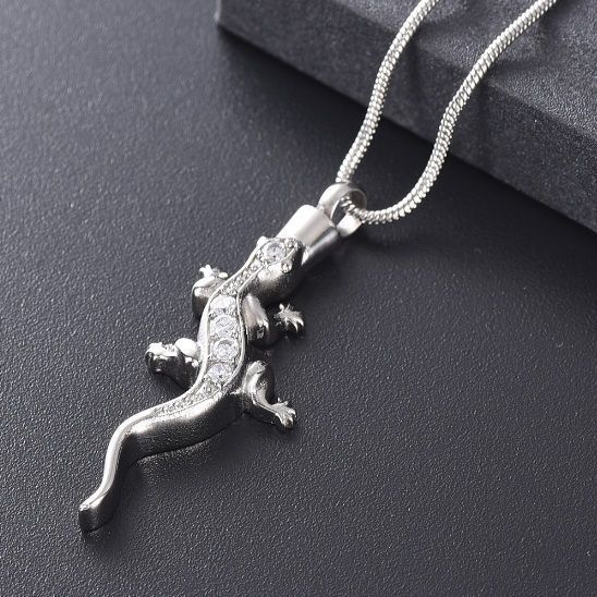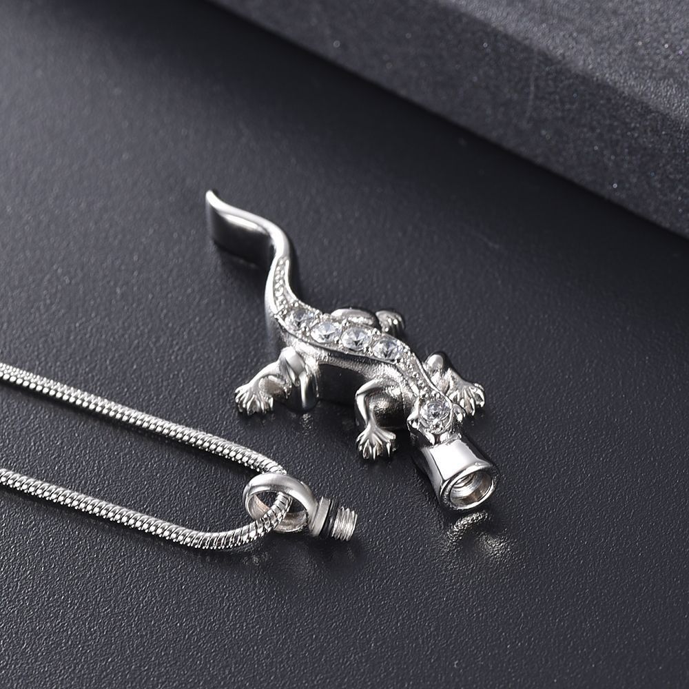 Náhrdelník z chirurgické oceli. Ocelový řetízek s pietním přívěskem ve tvaru ještěrky. Přívěsek vyroben z certifikované chirurgické oceli 316L. Z přední strany je přívěsek osazen čirými zirkony. Vnitřní prostor přívěsku umožňuje uchovat malou část spálených pozůstatků zesnulých milovaných, pramínek vlasů nebo sušené obřadní květy. Část na popel je uzavřena těsnícím závitovým šroubem.