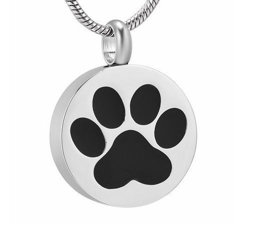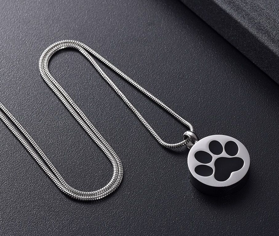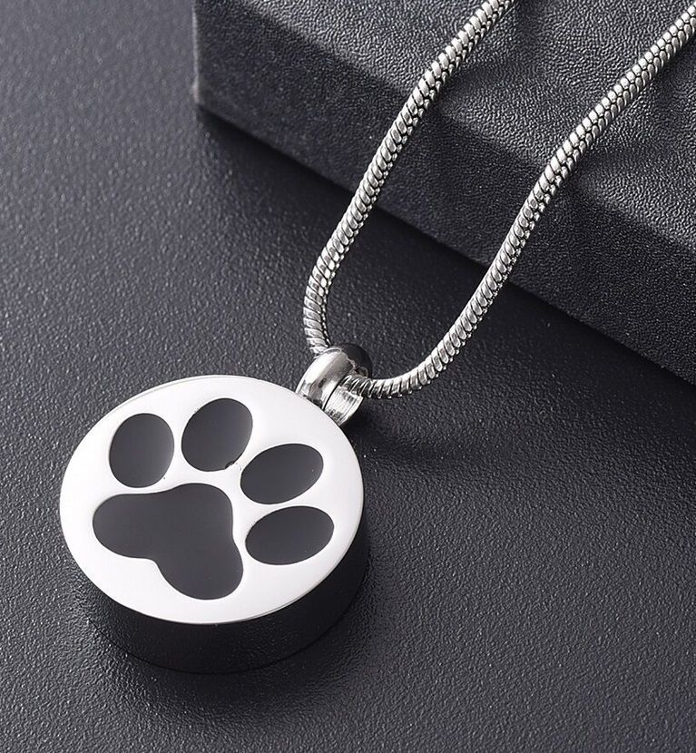Náhrdelník z chirurgické oceli. Ocelový řetízek s pietním přívěskem kulatého tvaru z přední strany zdobený černou tlapkou. Přívěsek vyroben z certifikované chirurgické oceli 316L. Vnitřní prostor přívěsku umožňuje uchovat malou část spálených pozůstatků zesnulých zvířecích miláčků nebo chomáček chloupků. Část na popel je uzavřena těsnícím závitovým šroubem.