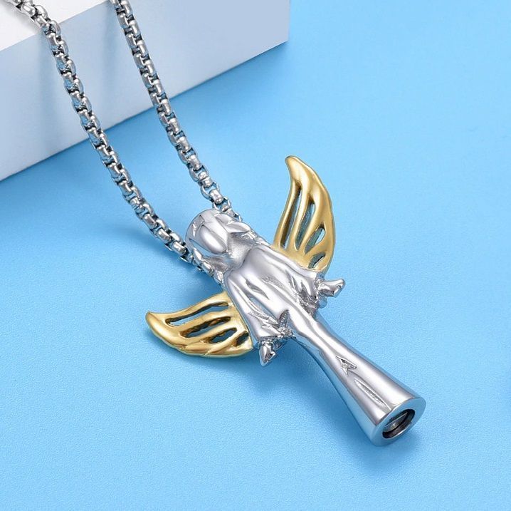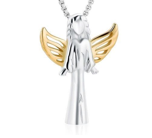 Náhrdelník z chirurgické oceli. Ocelový řetízek s pietním přívěskem ve tvaru anděla. Přívěsek vyroben z certifikované chirurgické oceli 316L. Vnitřní prostor přívěsku umožňuje uchovat malou část spálených pozůstatků milovaných zesnulých, pramínek vlasů nebo sušené obřadní květy. Část na popel je uzavřena těsnícím závitovým šroubem.