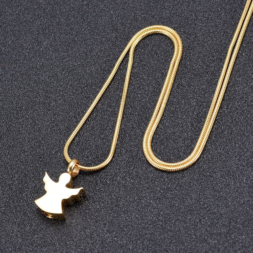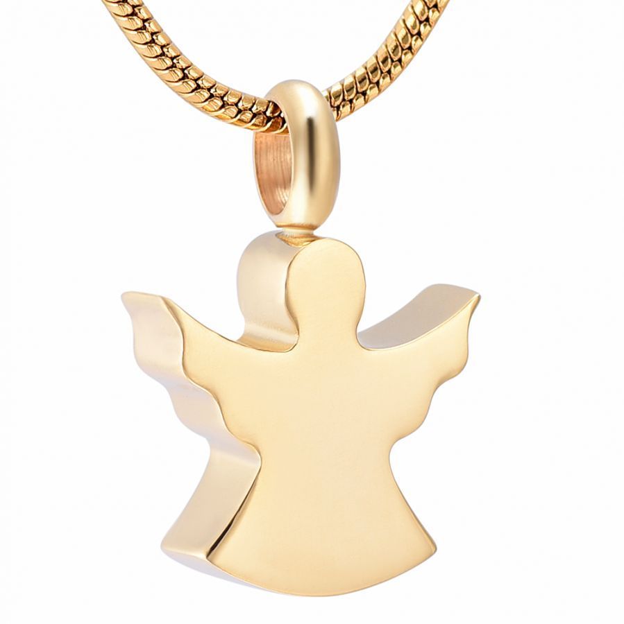 Náhrdelník z chirurgické oceli. Ocelový řetízek s pietním přívěskem ve tvaru andílka. Přívěsek vyroben z certifikované chirurgické oceli 316L s povrchovou úpravou v barvě žlutého zlata. Vnitřní prostor přívěsku umožňuje uchovat malou část spálených pozůstatků zesnulých milovaných, pramínek vlasů nebo sušené obřadní květy. Část na popel je uzavřena těsnícím závitovým šroubem.