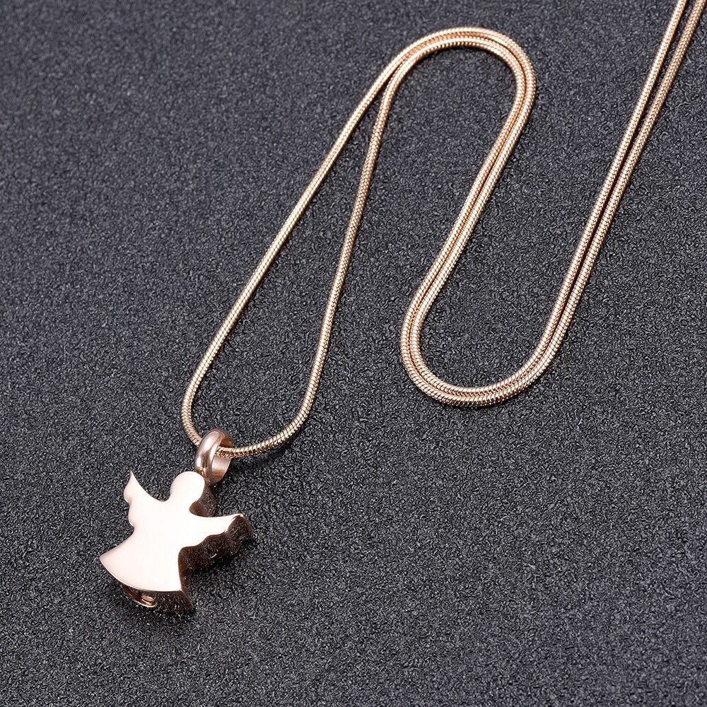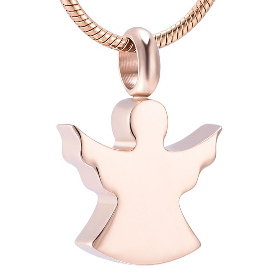 Náhrdelník z chirurgické oceli. Ocelový řetízek s pietním přívěskem ve tvaru andílka. Přívěsek vyroben z certifikované chirurgické oceli 316L s povrchovou úpravou v barvě růžového zlata. Vnitřní prostor přívěsku umožňuje uchovat malou část spálených pozůstatků zesnulých milovaných, pramínek vlasů nebo sušené obřadní květy. Část na popel je uzavřena těsnícím závitovým šroubem.
