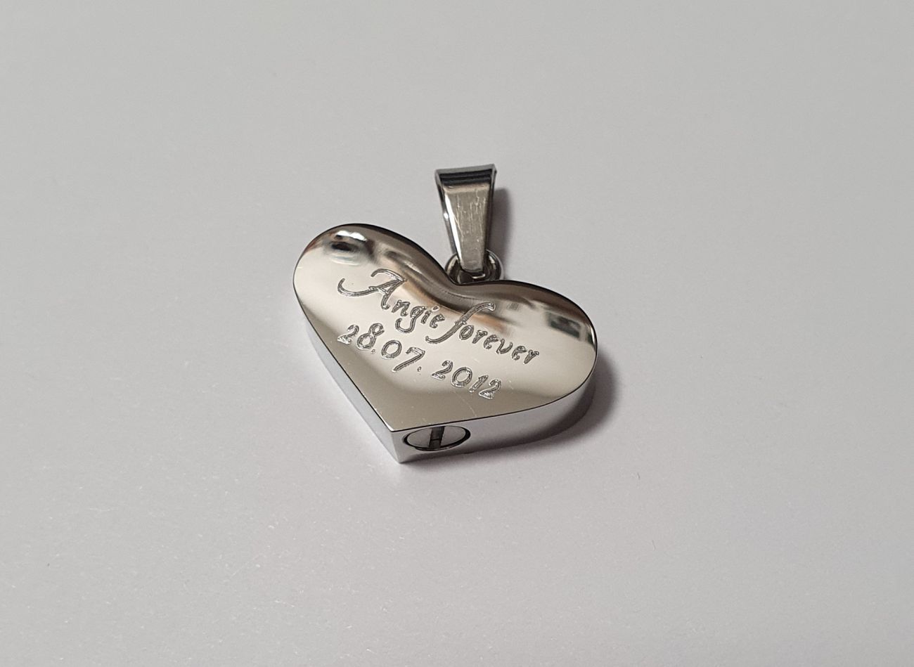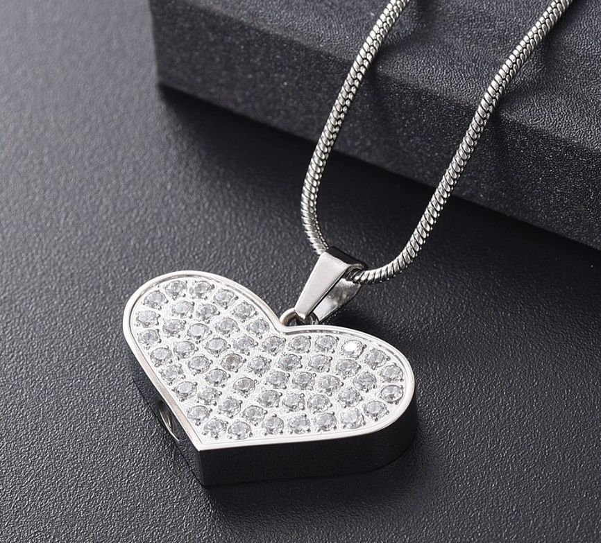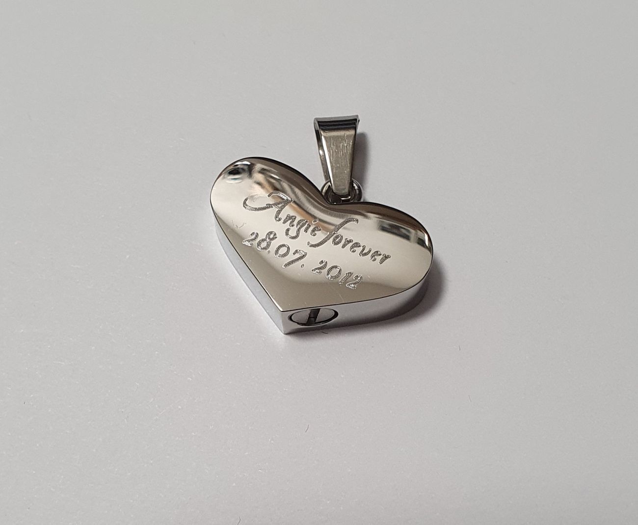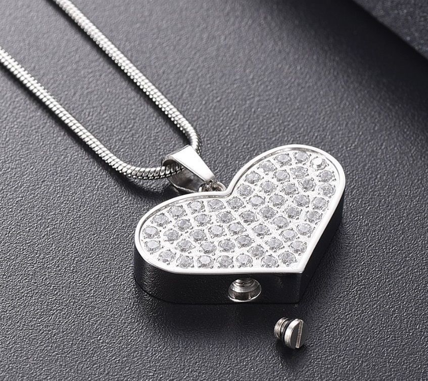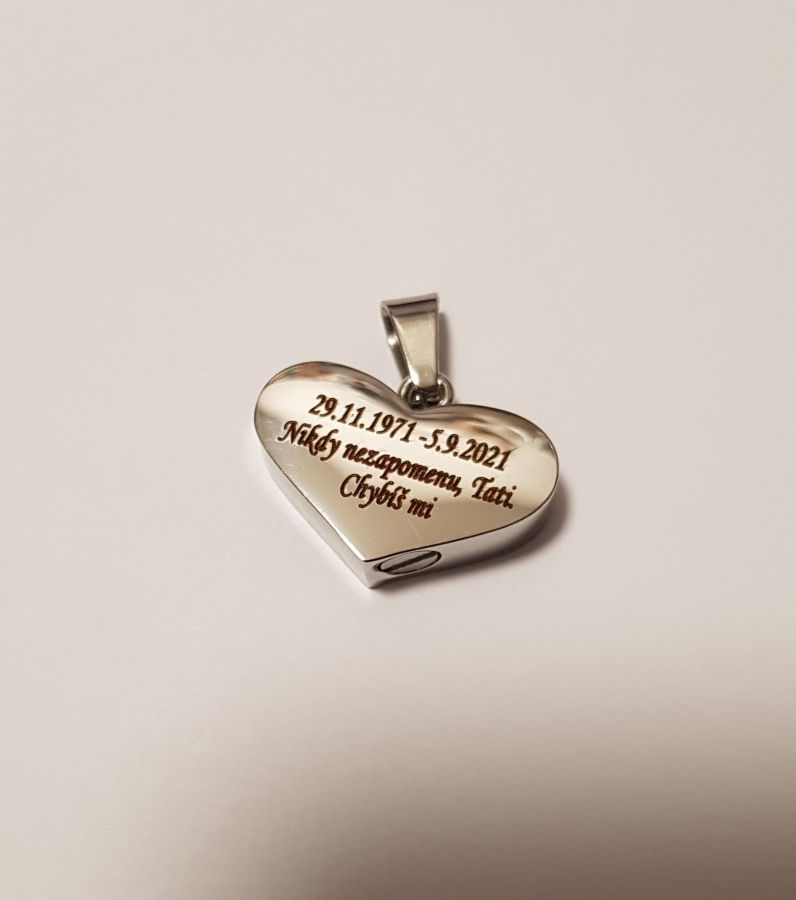 Náhrdelník z chirurgické oceli. Ocelový řetízek s pietním přívěskem ve tvaru srdce. Přívěsek vyroben z certifikované chirurgické oceli 316L. Z přední strany je přívěsek osazen čirými zirkony. Vnitřní prostor přívěsku umožňuje uchovat malou část spálených pozůstatků zesnulých milovaných, pramínek vlasů nebo sušené obřadní květy. Část na popel je uzavřena těsnícím závitovým šroubem.