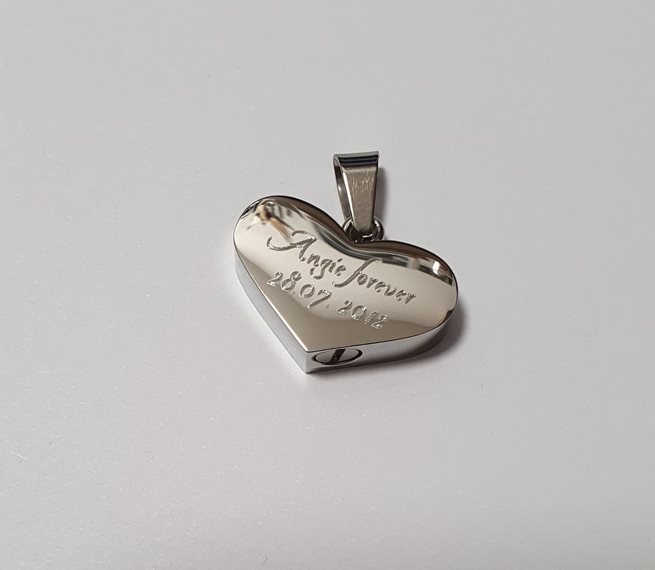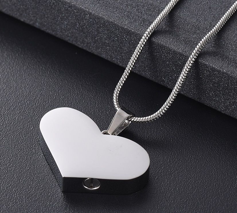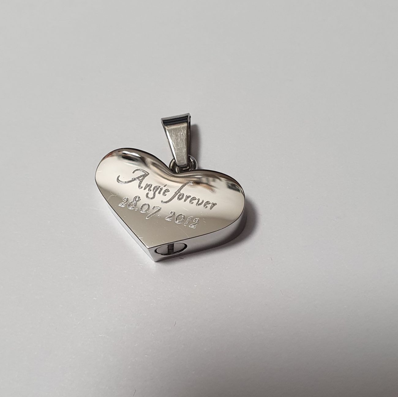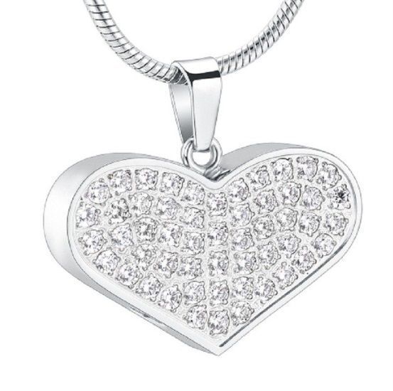 Náhrdelník z chirurgické oceli. Ocelový řetízek s pietním přívěskem ve tvaru srdce. Přívěsek vyroben z certifikované chirurgické oceli 316L. Z přední strany je přívěsek osazen čirými zirkony. Vnitřní prostor přívěsku umožňuje uchovat malou část spálených pozůstatků zesnulých milovaných, pramínek vlasů nebo sušené obřadní květy. Část na popel je uzavřena těsnícím závitovým šroubem.