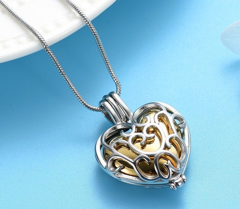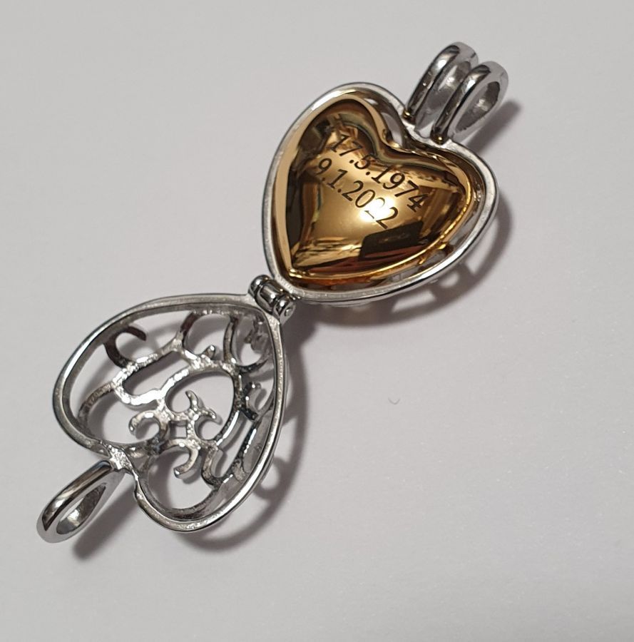 Náhrdelník z chirurgické oceli. Ocelový řetízek had s pietním přívěskem ve tvaru ornamentálního srdce. Přívěsek vyroben z certifikované chirurgické oceli 316L. Vnější ornamentální srdce má uvnitř malou zlacenou urničku ve tvaru srdíčka, kterou lze vyndat po rozevření vnějšího ornamentálního srdce. Vnitřní prostor urničky umožňuje uchovat malou část spálených pozůstatků milovaných zesnulých, pramínek vlasů nebo sušené obřadní květy. Urnička je šroubovací.