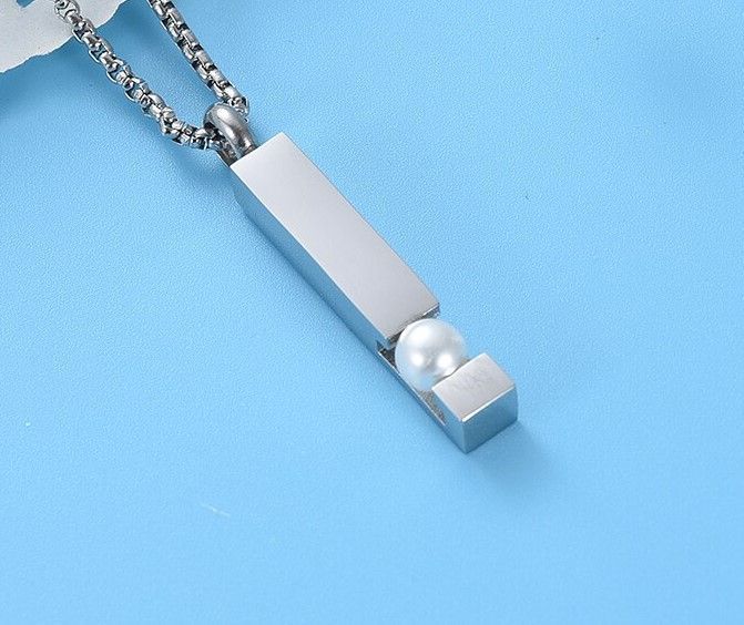 Náhrdelník z chirurgické oceli. Ocelový řetízek s pietním přívěskem ve tvaru hranolu. Přívěsek vyroben z certifikované chirurgické oceli 316L. Z přední strany je přívěsek osazen perlou. Vnitřní prostor přívěsku umožňuje uchovat malou část spálených pozůstatků zesnulých milovaných, pramínek vlasů nebo sušené obřadní květy. Část na popel je uzavřena těsnícím závitovým šroubem.
