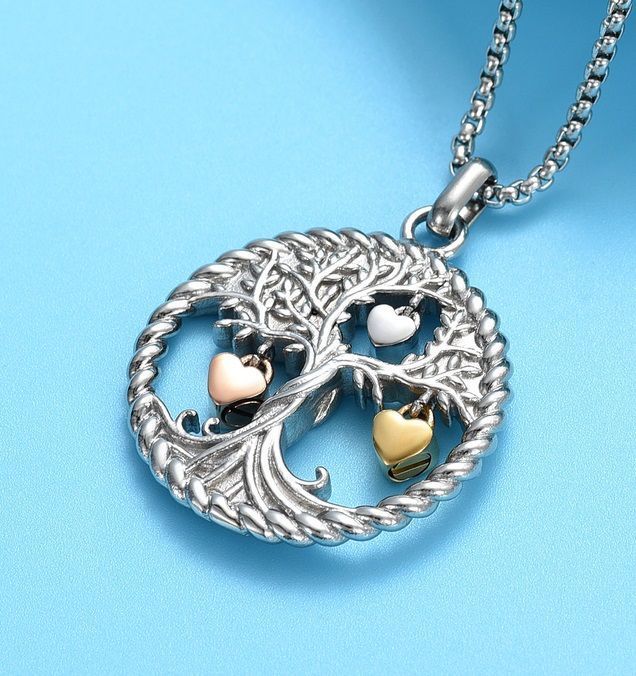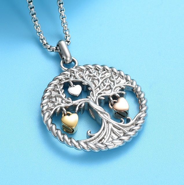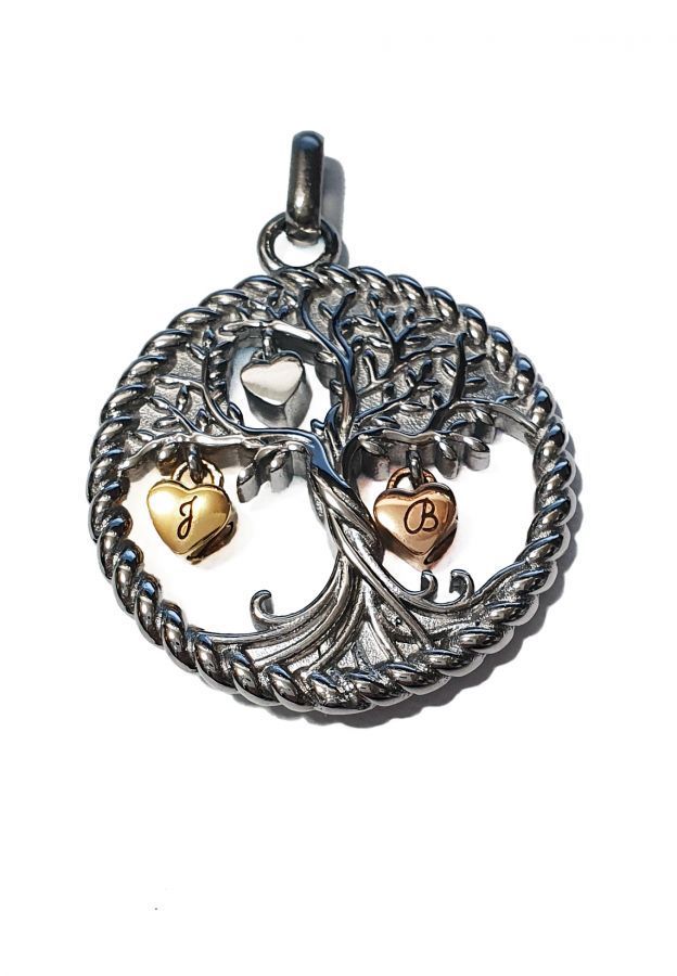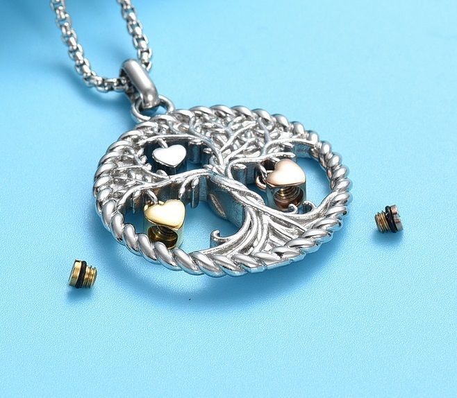 Náhrdelník z chirurgické oceli. Ocelový řetízek s pietním přívěskem ve tvaru stromu života. Na stromu jsou zavěšeny přívěsky ve tvaru srdíček, z nichž dvě (zlacená) jsou plnitelná. Přívěsek vyroben z certifikované chirurgické oceli 316L. Vnitřní prostor přívěsků (srdíček) umožňuje uchovat malou část spálených pozůstatků zesnulých milovaných, pramínek vlasů nebo sušené obřadní květy. Část na popel je uzavřena těsnícím závitovým šroubem.
