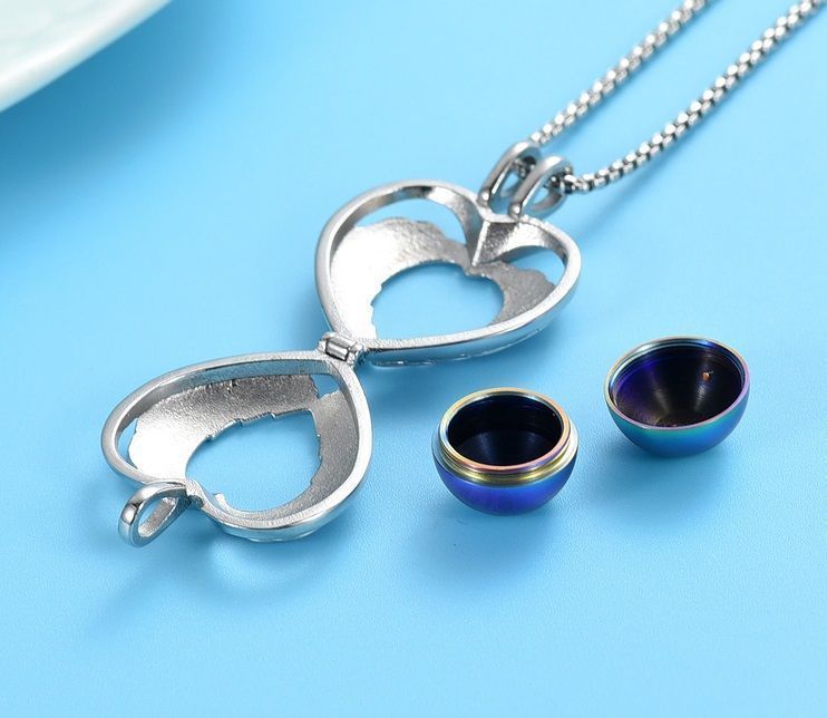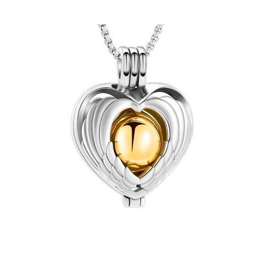 Náhrdelník z chirurgické oceli. Ocelový řetízek had s pietním přívěskem ve tvaru srdce z andělských křídel, které uvnitř skrývá kuličku v barvě žlutého zlata. Přívěsek vyroben z certifikované chirurgické oceli 316L. Vnitřní prostor kuličky umožňuje uchovat malou část spálených pozůstatků milovaných zesnulých, pramínek vlasů nebo sušené obřadní květy. kulička je šroubovací.