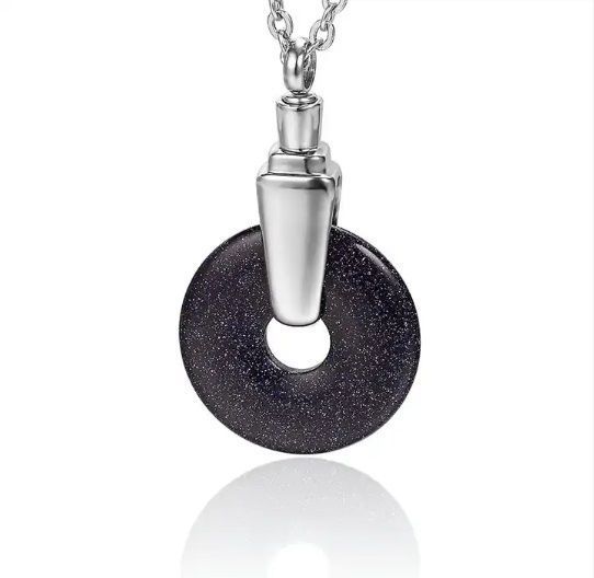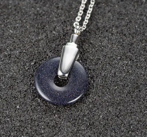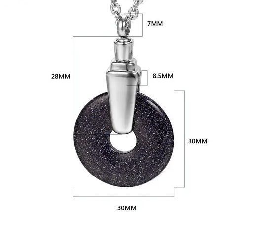 Náhrdelník z chirurgické oceli. Ocelový očkový řetízek s pietním přívěskem kulatého tvaru. Kolečko je z přírodního kamene - modrý pískovec, drženého v ocelové objímce, která je z vrchní strany šroubovací a její vnitřní část lze naplnit nepatrným množstvím spálených pozůstatků milovaných zesnulých, pramínek vlasů nebo sušené obřadní květy. Set je vyroben z certifikované chirurgické oceli 316L.