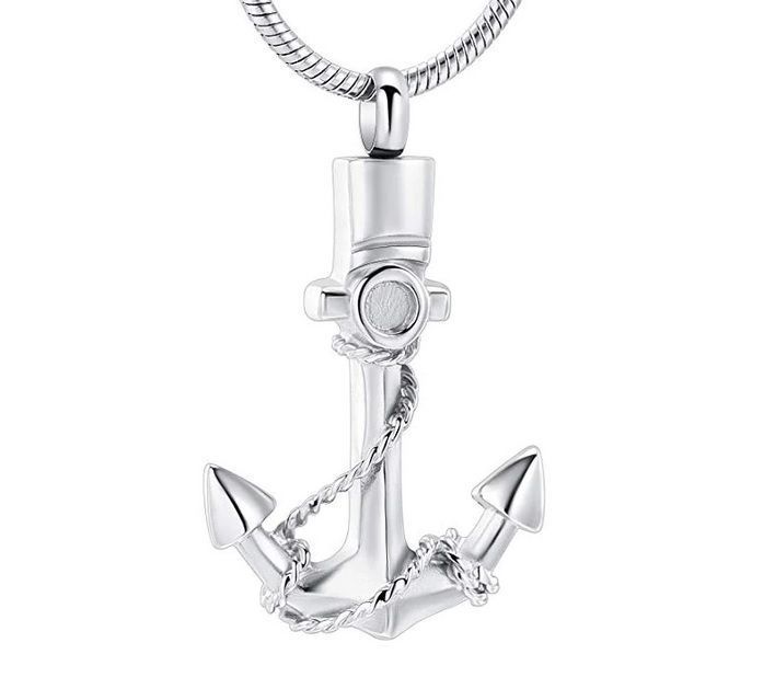 Náhrdelník z chirurgické oceli. Ocelový řetízek s pietním přívěskem ve tvaru námořnické kotvy. Šperk je vyroben z certifikované chirurgické oceli 316L. Vnitřní prostor přívěsku umožňuje uchovat malou část spálených pozůstatků zesnulých milovaných, pramínek vlasů nebo sušené obřadní květy. Část na popel je uzavřena těsnícím závitovým šroubem.