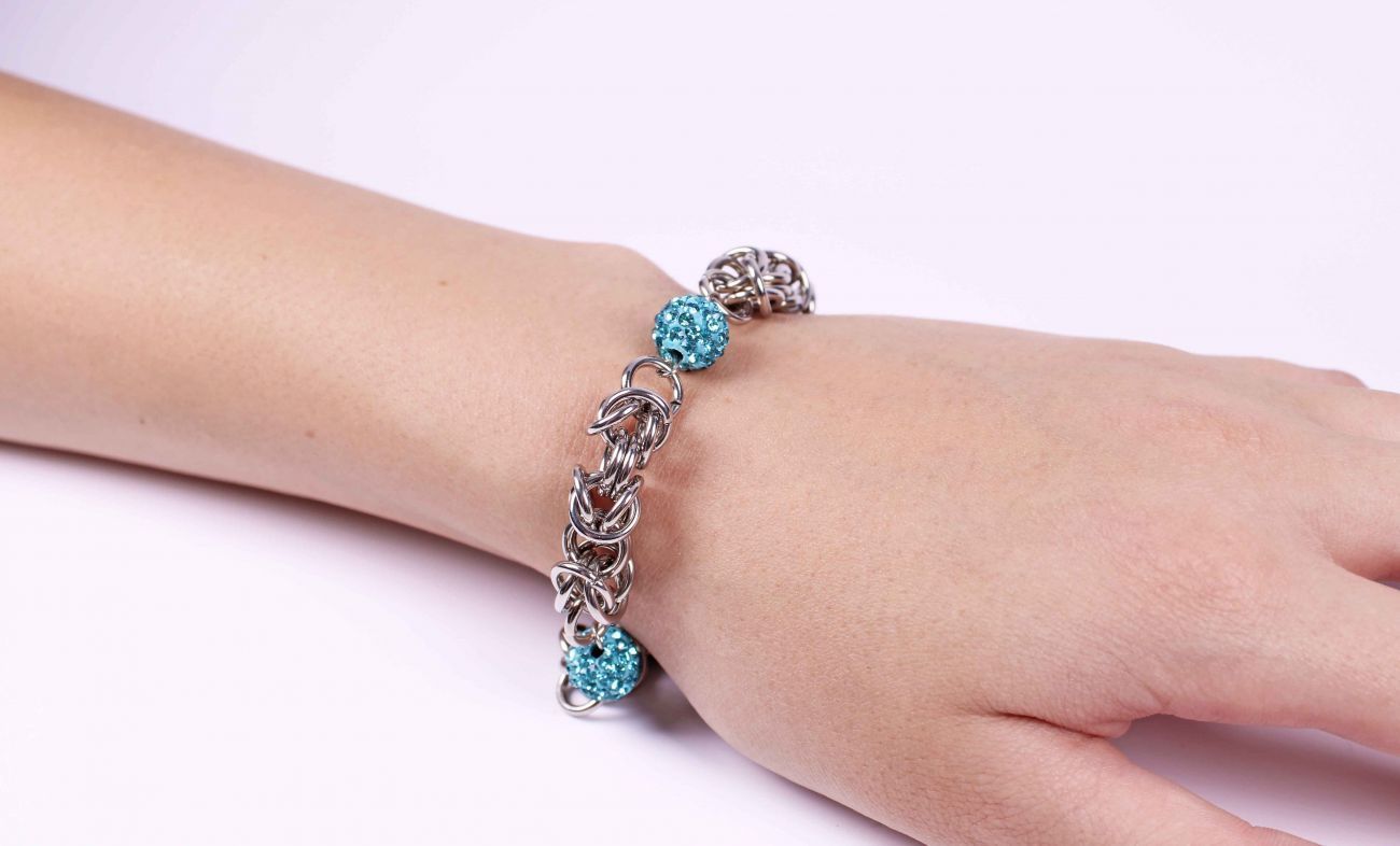 Náramek z chirurgické oceli. Lesklá povrchová úprava. 3 kuličky poseté modrými krystalky.