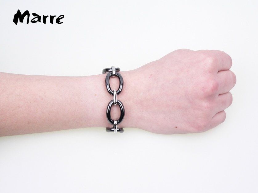 Masivní náramek z keramiky v kombinaci s chirurgickou ocelí. Očka spojující keramiku jsou z chirurgické oceli. Lesklá povrchová úprava. Náramek má tzv. americké zapínání.