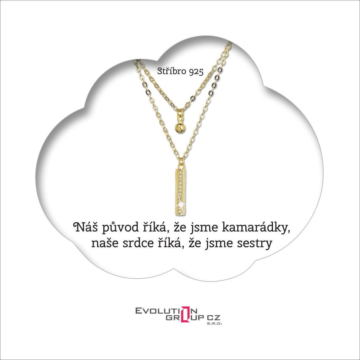 Dárkový set obsahuje pozlacený dvouřadý stříbrný náhrdelník kulička a úzký obdélník se zirkony bílý, který je zavěšený na dárkové kartě s nádherným přáním Náš původ říká, že jsme kamarádky, naše srdce říká, že jsme sestry. Krásný symbolický dárek pro vaši kamarádku a nejlepší přítelkyni, která je vám blízká, jako vlastní sestra. Náhrdelník symbolizující okamžiky, které si chcete udržet v paměti na nekonečně dlouho.