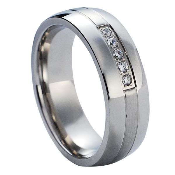 Dámský snubní prsten z chirurgické oceli zdobený matným pruhem ve středové linii a 5ti zirkony čiré barvy