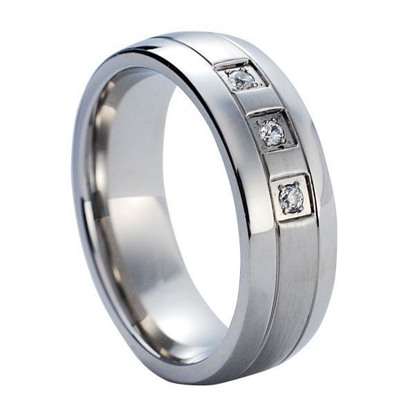 Dámský snubní prsten z chirurgické oceli zdobený matným pruhem ve středové linii a 3mi zirkony čiré barvy