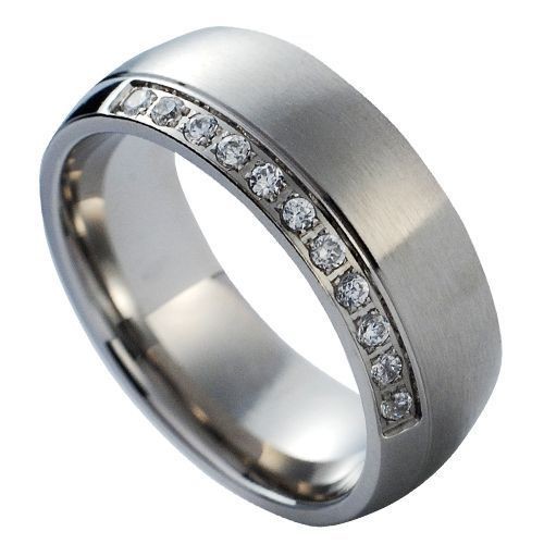 Dámský ocelový snubní prsten je vyrobený s lesklou a matnou povrchovou úpravou, dekorovaný zirkony čiré barvy