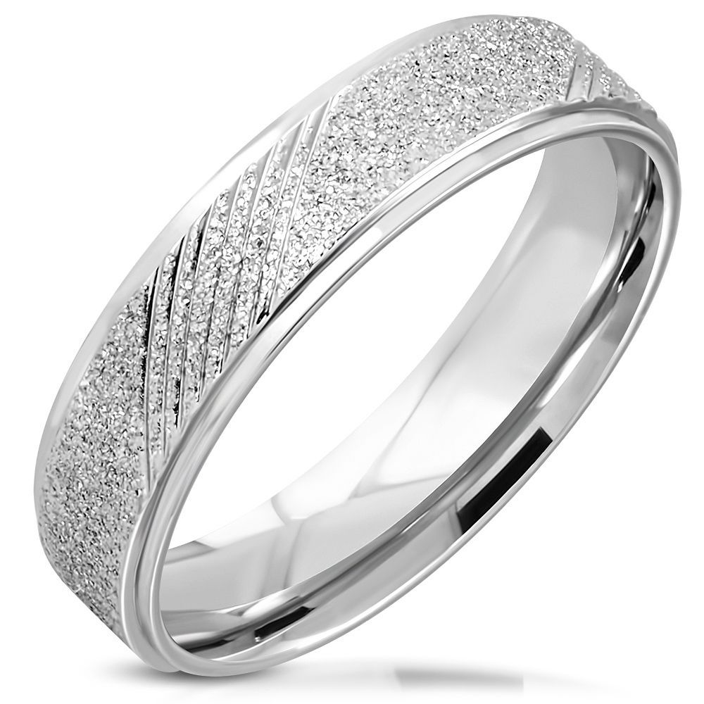Dámský snubní ocelový prsten s jemnými šikmými ozdobnými proužky a pískovaným povrchem