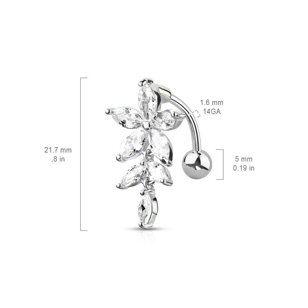 Obrácený piercing do pupíku s kytičkami, čiré zirkony
