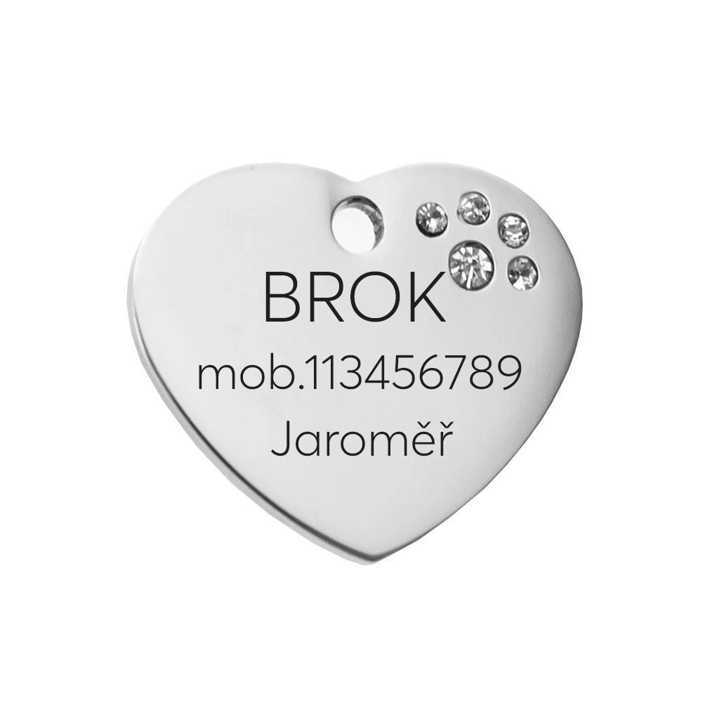 Ocelová psí / kočičí známka ve tvaru srdce se zirkony