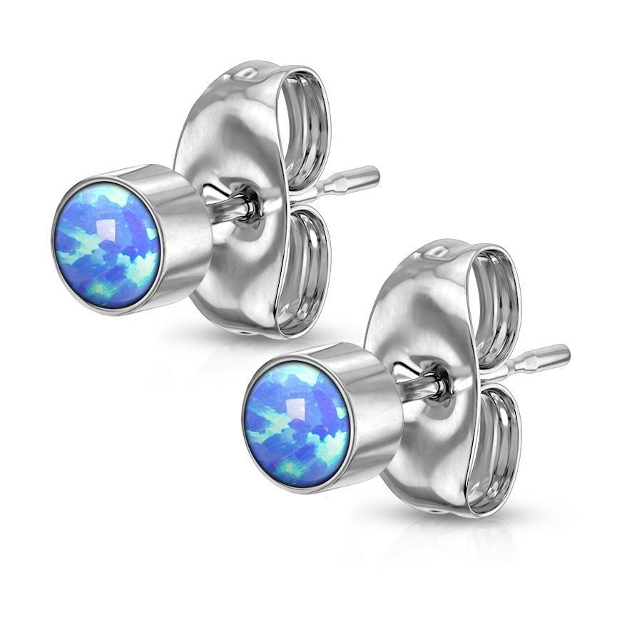 Ocelové náušnice zdobené syntetickými opály modré barvy.