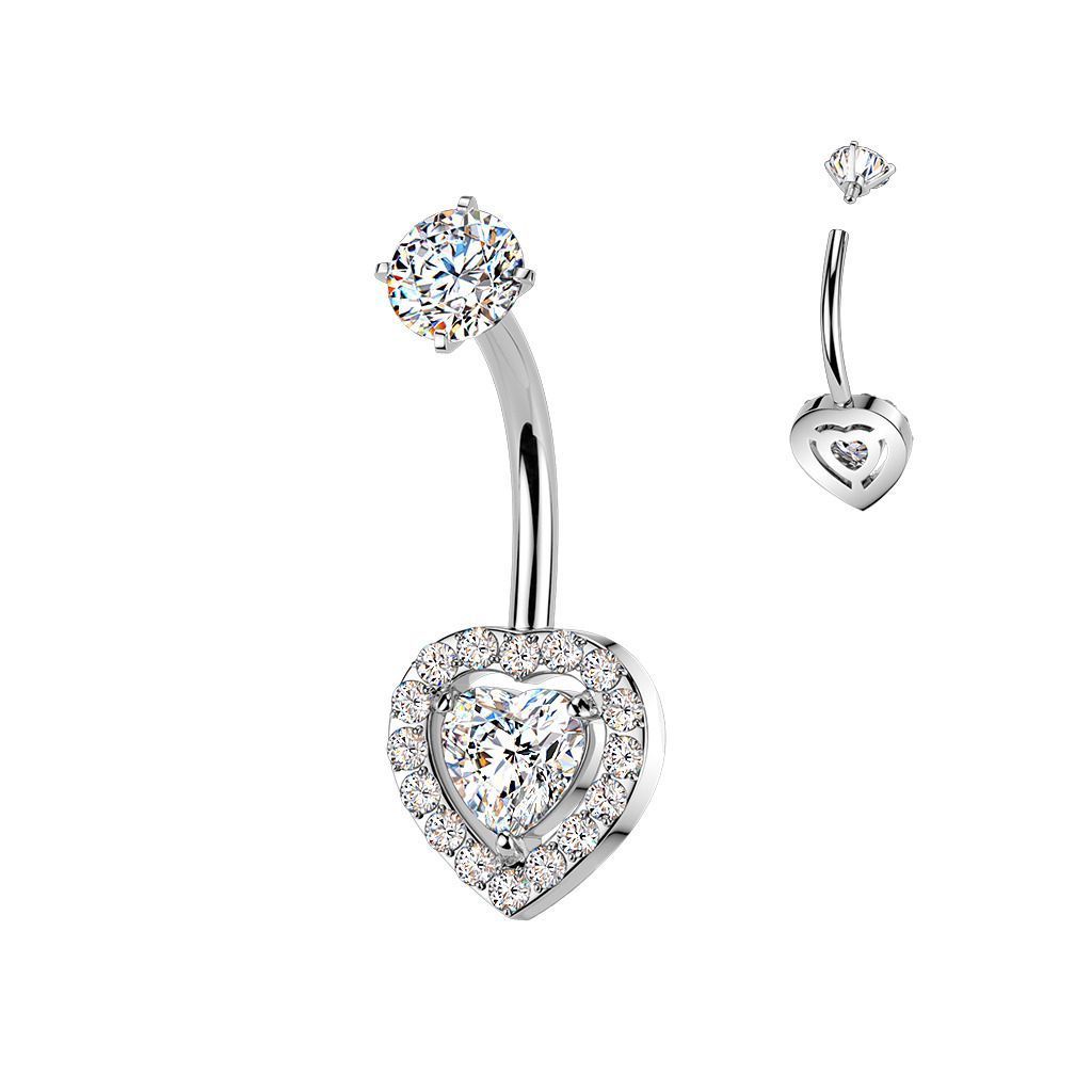 Elegantní piercing do pupíku vyrobený z chirurgické oceli 316L je zdobený třpytivými zirkony v motivu srdce. Dominantní středový zirkon ve tvaru srdce je doplněn jemným lemem z drobných čirých zirkonů, které šperku dodávají výrazný lesk a luxusní vzhled.
