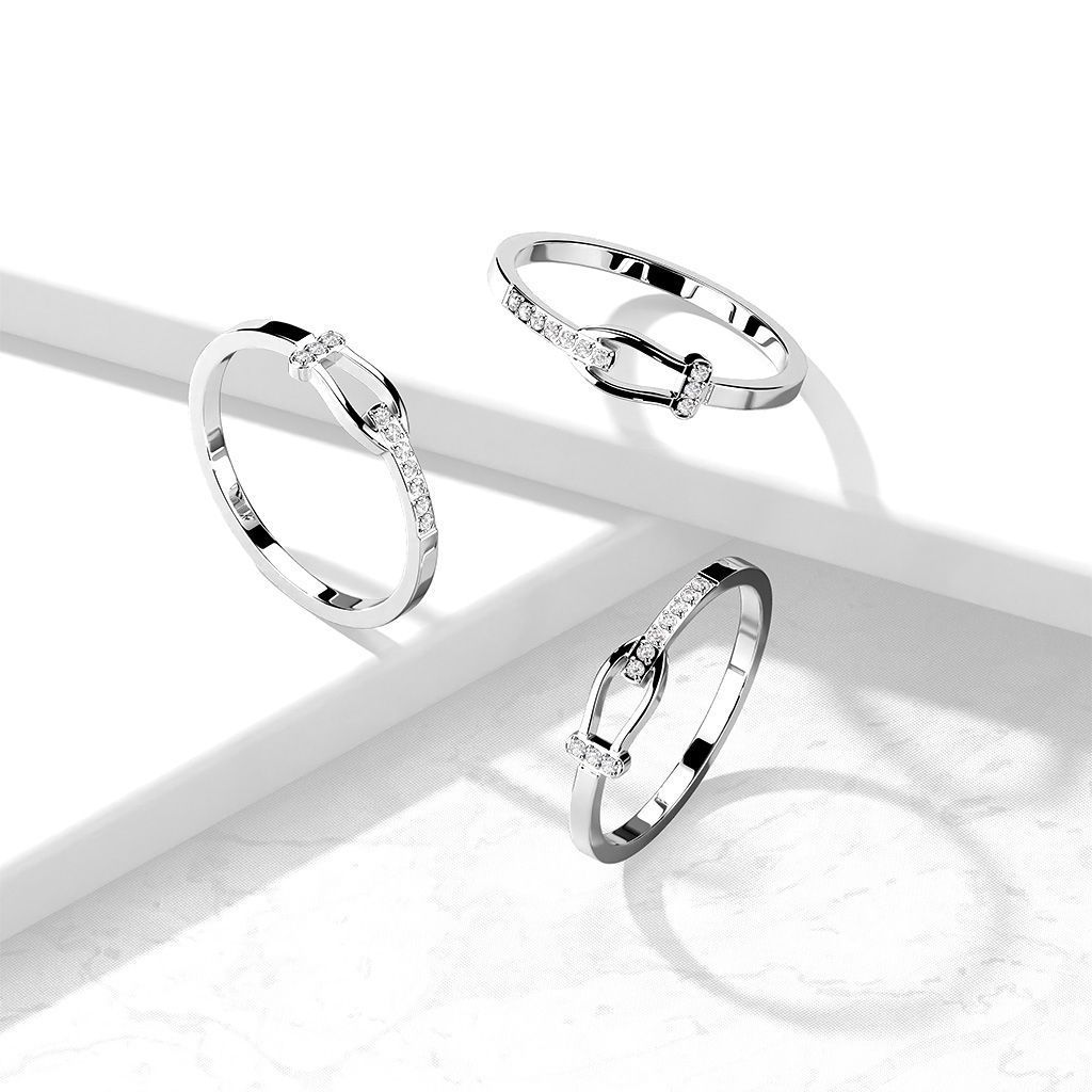 Ocelový prsten zdobený čirými zirkony.