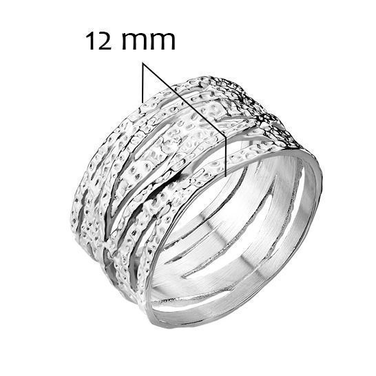 Extravagantní, zajímavě řešený ocelový prsten s tepaným povrchem.