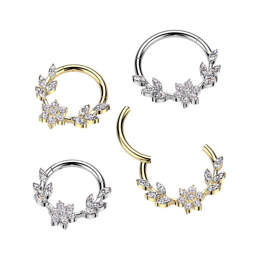 Piercing kruh segment zdobený kytičkou s lístky s čirými zirkony. Piercing má praktický rozevírací pantík.