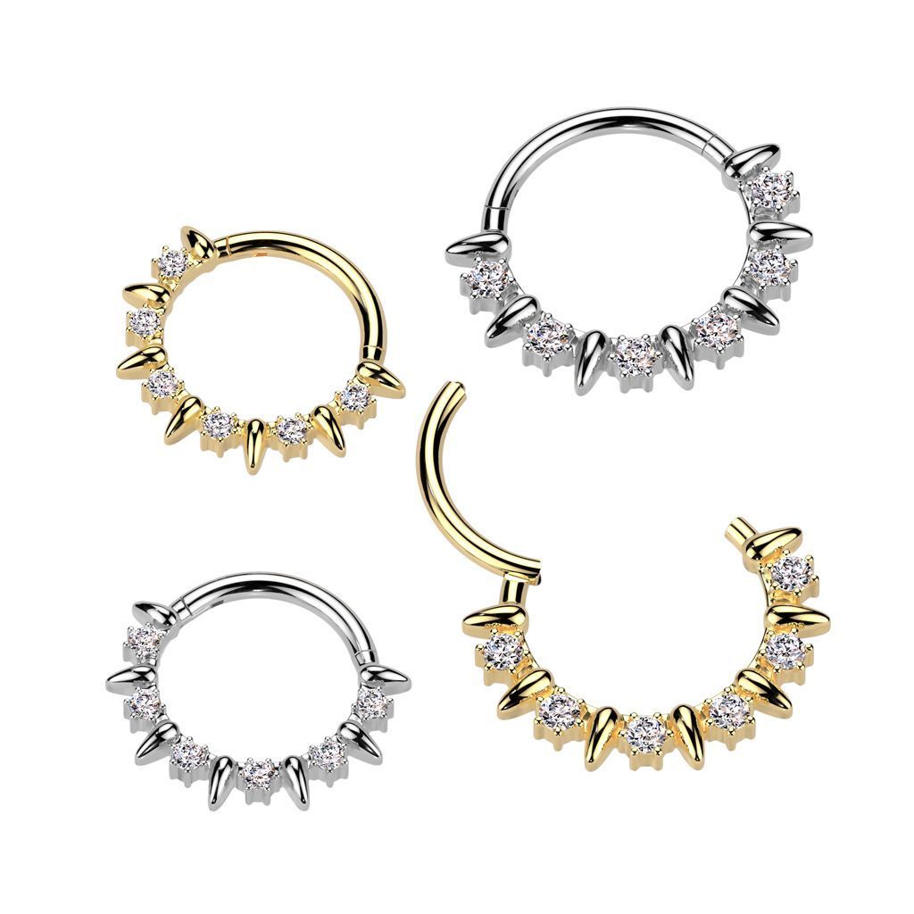 Piercing kruh segment s ozdobnými droboučkými hrotíky a čirými zirkony. Piercing má praktický rozevírací pantík.