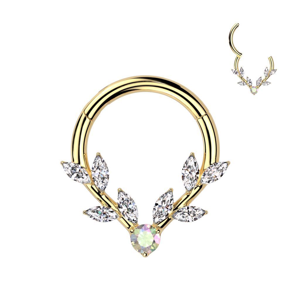 Piercing kruh segment zdobený lístky s čirými zirkony. Piercing má praktický rozevírací pantík.