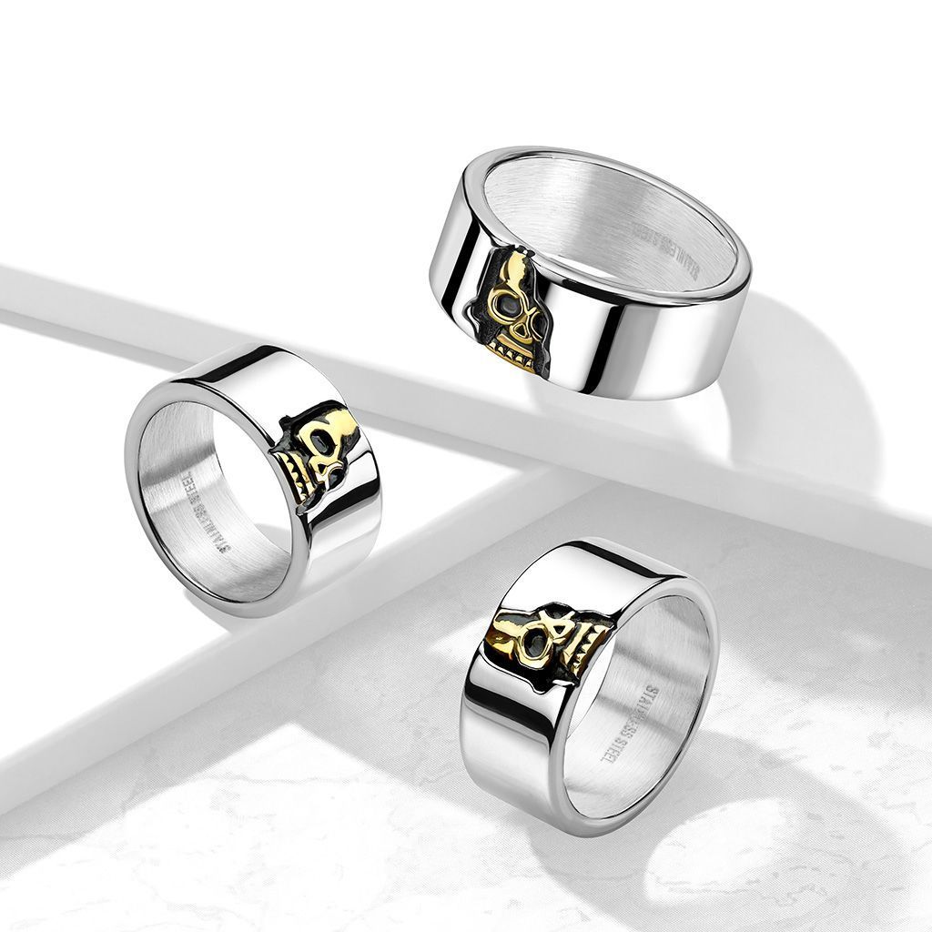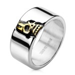 Lesklý pánský masivnější prsten zdobený zlaceným motivem lebky.