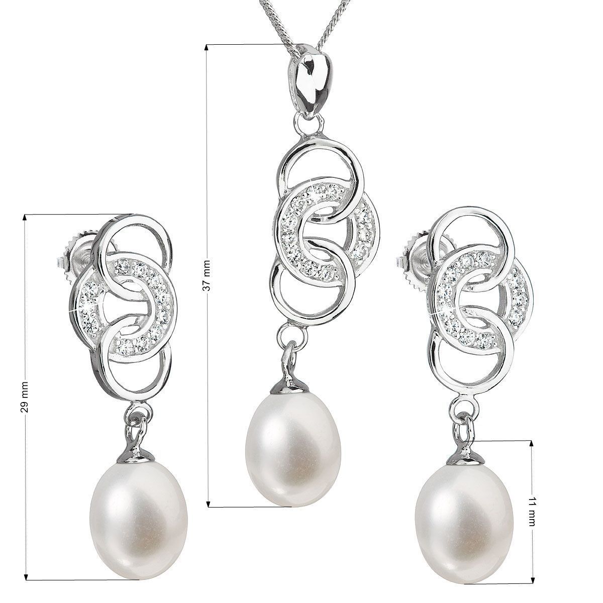 Perlová souprava šperků 29036.1 obsahuje luxusní visací náušnice o délce 29 mm a stříbrný řetízek s perlovým přívěškem. Stříbro, z kterého jsou šperky vyrobeny, má ryzost 925/1000 a je včetně povrchové úpravy rhodiem. Šperky jsou doplněny velkou oválnou říční perlou v bílé barvě, jež spadá do kategorie nejvyšší kvality AAA. Kromě perel jsou šperky doplněny ještě o malé blýskavé zirkony, které šperkům dodají ještě větší šmrnc. Na náušnici i přívěšku je celkem 11 zirkonů. Náušnici zapnete na šroubek, který zabrání její nechtěné ztrátě. Vzhledem k tomu, že šperky neobsahují nikl, mohou si je bez obav na ples vzít i alergici.