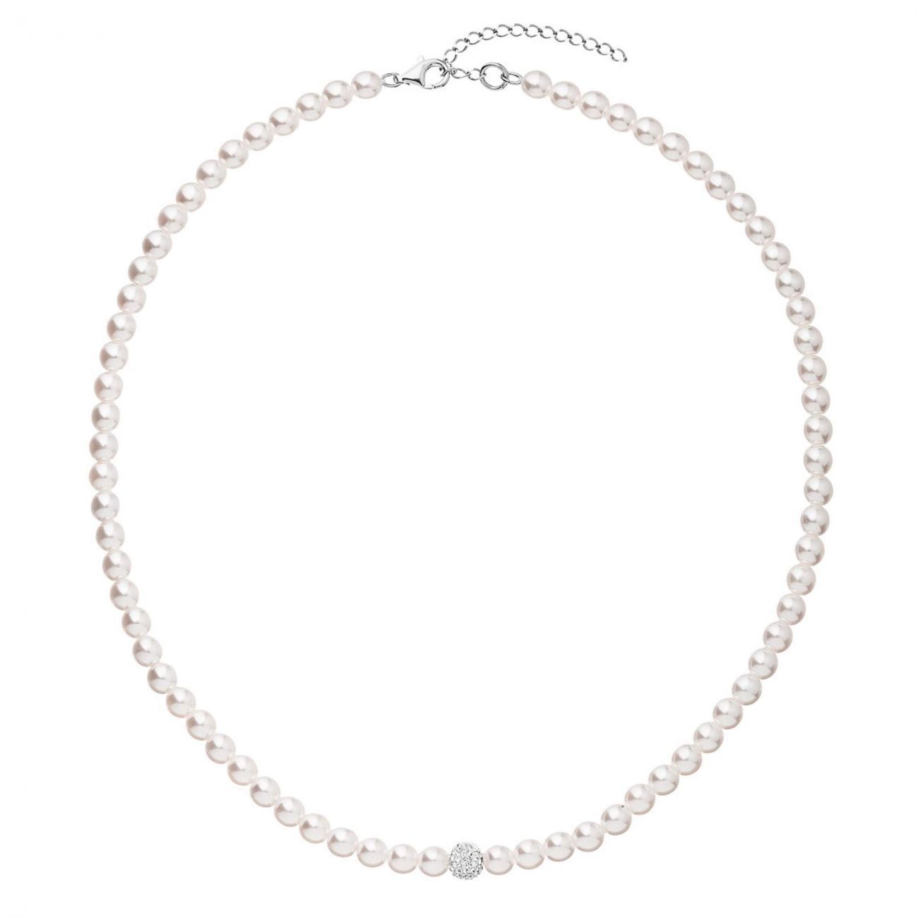 Perlový náhrdelník 32063.1 v délce 46 cm je poskládán z malých bílých perel, mezi něž je navléknuta kulička osázená mnoha Preciosa krystalky v bílé barvě. Na zapínání náhrdelníku bylo použito stříbro ryzosti 925/1000, které prošlo úpravou rhodiem. Rhodium stříbro ochrání proti zčernání, zežloutnutí i poškrábání. Náhrdelník je vhodný i pro alergiky, neobsahuje totiž nikl.