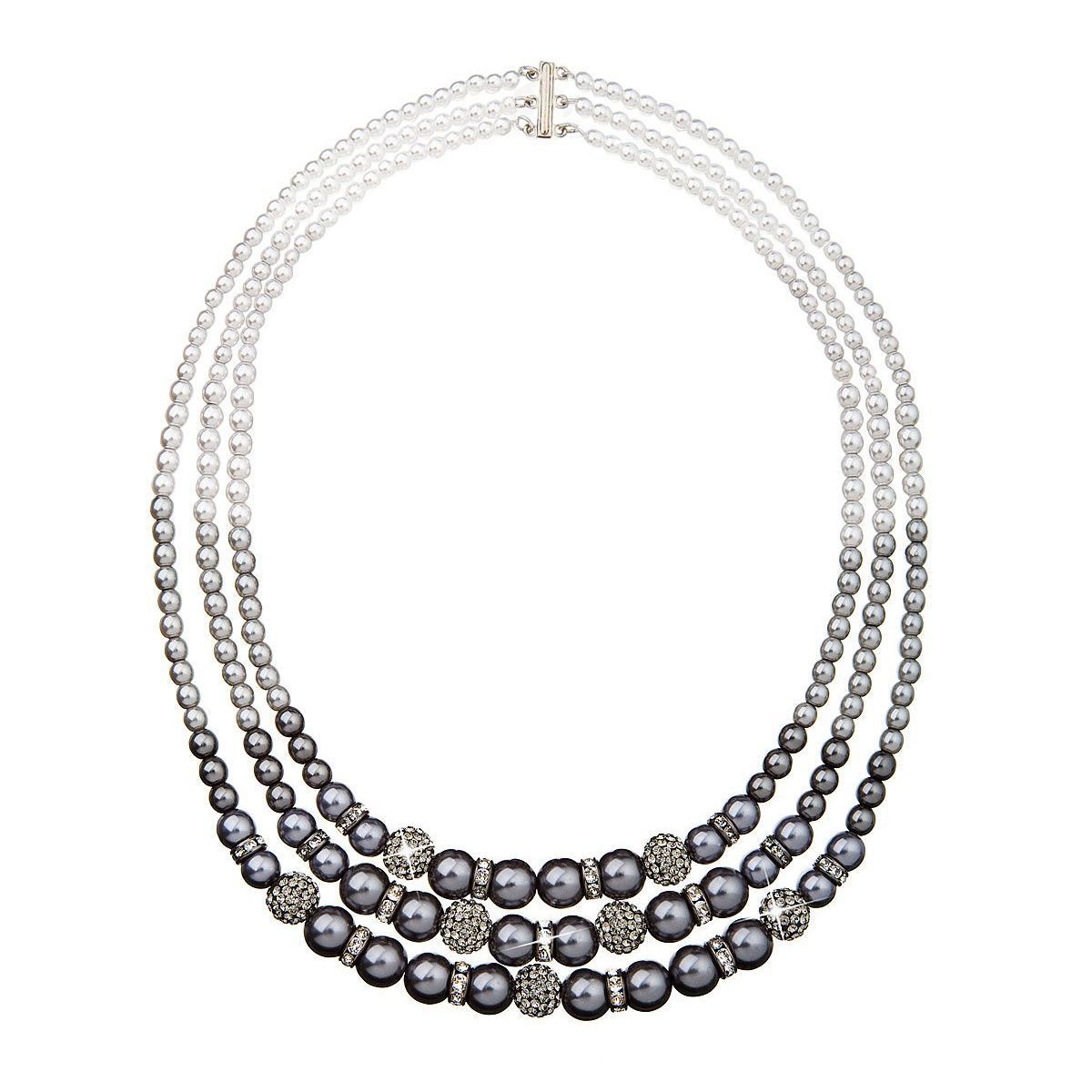 Trojitý perlový náhrdelník 32010.3 v délce 45 cm je složen ze 3 řad různě velkých šedých a bílých syntetických perel, mezi něž jsou navléknuty rhuteniové rondelky osázené Swarovski krystalky. Krystaly jsou v bílé barvě. Na výsuvné zapínání náhrdelníku bylo použito stříbro ryzosti 925/1000, které prošlo úpravou rhodiem. Rhodium stříbro ochrání proti zčernání, zežloutnutí i poškrábání. Náhrdelník je vhodný i pro alergiky, neobsahuje totiž nikl.