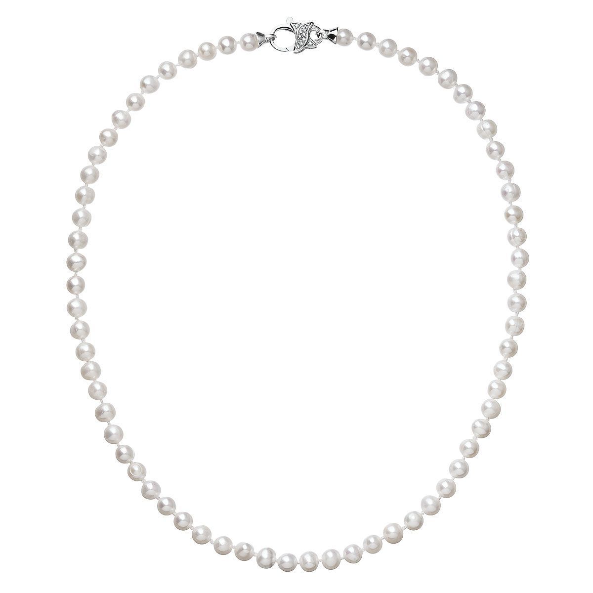 Perlový náhrdelník 22002.1 o celkové délce 45 cm se skládá z oválných pravých říčních perel v bílé barvě. Každá perla je zajištěna uzlíkovou vazbou, a tak se při nechtěném přetržení náhrdelníku nestane, že se vám perly rozkutálí na všechny strany. Zajímavě je řešené stříbrné zapínání náhrdelníku ve tvaru karabiny s několika ozdobnými zirkony. Stříbro použité na zapínání náhrdelníku má ryzost 925/1000 a rhodiovou povrchovou úpravu. Náhrdelník neobsahuje nikl, a tak ho mohou nosit i alergici.