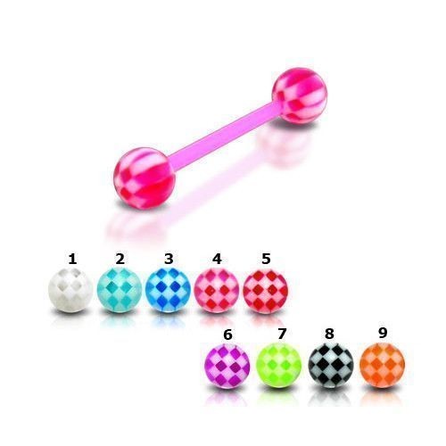 Piercing je vyroben z bioplastu. Je pružný, ohebný. Kuličky s kostičkovaným šachovnicovým vzorem vyniknou pod UV světlem.